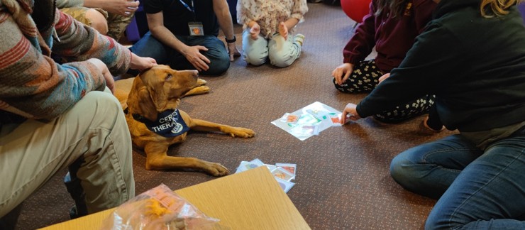 A wellbeing session with ‘Nelly the Therapy Dog’ run by Aim Community (at FLAiM)